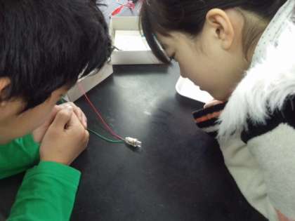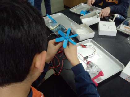 蓄電した電気を、光エネルギーや運動エネルギーに変換して確かめていました。(3月1日)