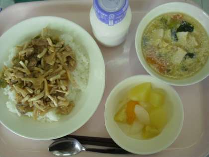 今日は、『チンジャーオロース丼』でした。チンジャーオロースには、炒めても崩れない、少し変わった豆腐も入っていました。(3月13日)