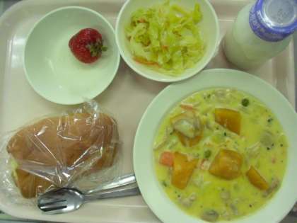 今日の『かぼちゃのクリームシチュー』には、甘いかぼちゃがゴロゴロ入っていました。また、今日の苺はビックサイズでした。(3月14日)