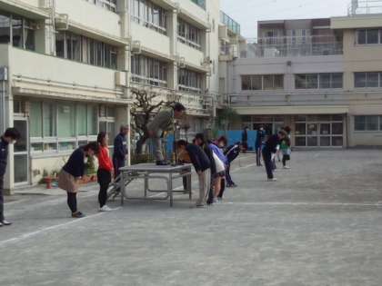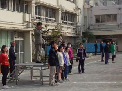 毎週、児童朝会の初めに6年生が代表で挨拶をしていました。今日が最後の朝会となりました。(3月18日)