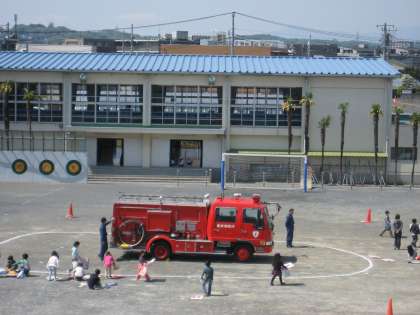校庭に消防車と消防士さんがやってきました。青空の下、のびのびと描きました。(4月22日)