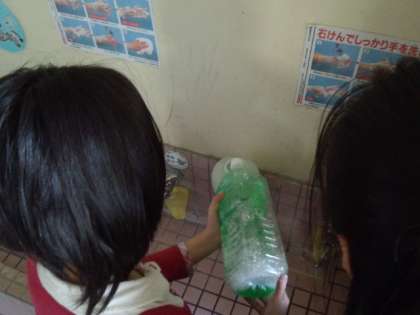 休み時間になると、保健委員会の子どもたちが洗面所にある薬剤を補充しています。(5月8日)