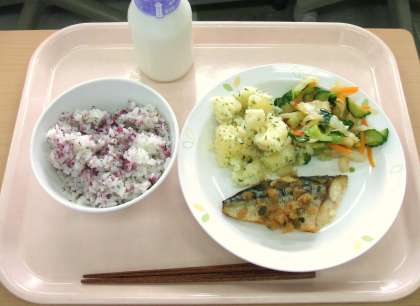 *ゆかりごはん *鯖の塩焼き大根おろしかけ *野菜のしょうが風味 *磯香ポテト *牛乳