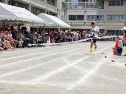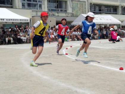 3年生6人と4年生6人が1チームになってリレーをしました。赤と黄色が赤組、白と青が白組で勝負しました。1人半周ずつ走り、アンカーの4年生だけ1周走りました。総合順位で得点が決まりました。(5月25日)