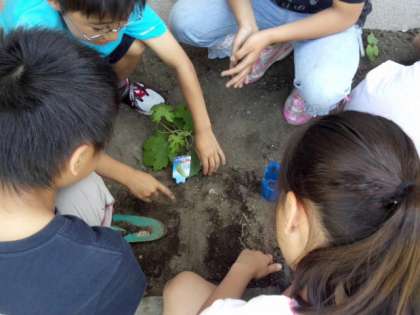 校庭の日がよく当たる場所にゴーヤの苗を植えました。これからは、しっかりと根付くように水やりを絶やさないようにします。(5月31日)