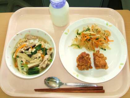 *クッパ *とりのから揚げ *糸寒天と野菜の和え物 *牛乳