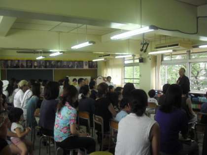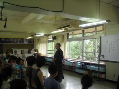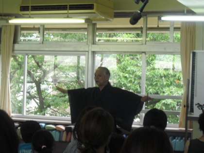 大藏流狂言師 善竹十郎先生をお招きし、「笑い」をテーマにお話をして頂きました。狂言「末廣がり」の囃子を一緒にうたったり、狂言についての質問をしたり、笑いとともにもりあがりました。(7月20日)