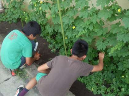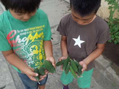 ゴーヤの水やりに来た子どもたちが、ゴーヤの収穫をしました。(8月9日)