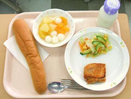 *黒砂糖パン *タンドリーチキン *コールスローサラダ *白玉入りフルーツポンチ *牛乳