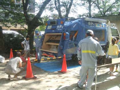 ゴミのゆくえ 公開日 2013/10/07 更新日 2013/10/07 4年生 砧清掃事務所の方に来ていただき、スケルトンの清掃車で、収集したゴミがどのようになるか体験、またDVDを見ながら、その後のゴミのゆくえについて学習しました。(10月3日) 4年