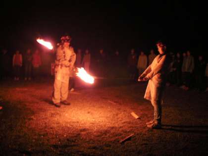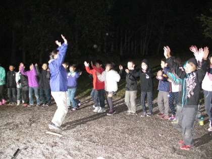 川場移動教室2日目(5年生) 公開日 2013/10/18 更新日 2013/10/18 5年生 月の光で辺りが見渡せるほど真っ暗な夜に、キャンプファイヤーが行われました。ゲームをしたり踊りを踊ったりして楽しい思い出を作っていました。(10月17日19時30分)