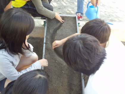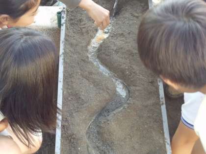 水の流れで浸食、運搬、堆積が起こる現象を実際に砂を使って模型を作り、予想を確かめました。(10月28日)