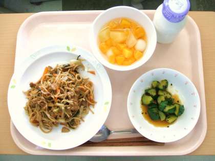 *ソース焼きそば *ピリ辛きゅうり *白玉入りフルーツポンチ *牛乳