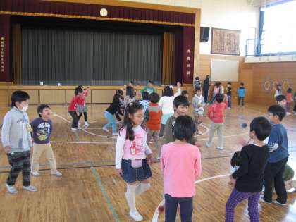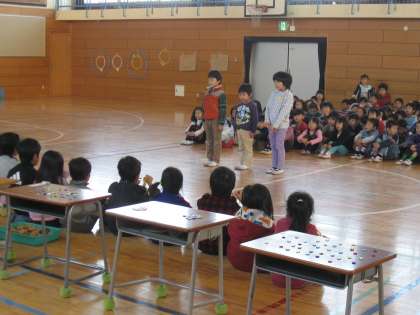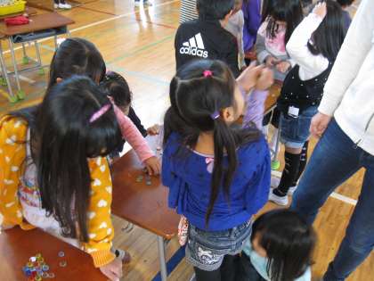 近くの保育園のおともだちが学校見学に来てくれました。そこで、1年生といっしょに体育館で昔遊びを楽しんでもらいました。びーだま、こま、ぼうずめくり、けんだま、おはじき、はねつきなど、1年生はいろいろな遊びを用意してくれていました。