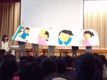 今朝の児童集会は、保健委員会からの発表をしました。健康に生活していくために、具体的な例を演じて低学年にもわかりやすい発表でした。(12月5日)