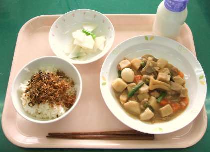*ごはん *カミカミつくだ煮 *鶏肉と里芋のうま煮 *かぶのレモン風味 *牛乳