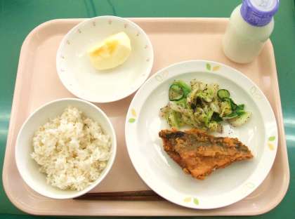 *雑穀ごはん *サバの竜田揚げ *野菜のゆかりかけ *くだもの(りんご) *牛乳