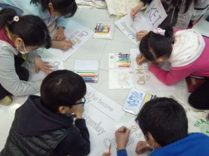 リズムに合わせていろいろの言葉を練習した後、グループごとに今度行う発表の準備をしました。(1月23日)