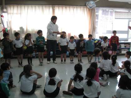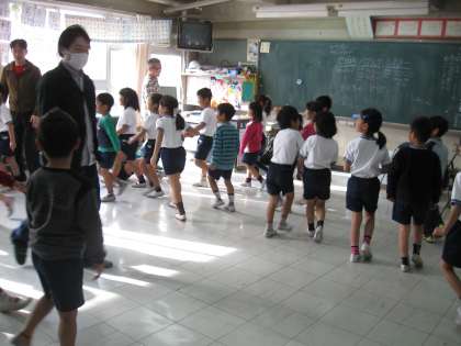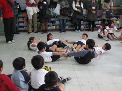 パブリックシアターの方に来ていただいて、各クラス毎に体で表現する楽しさをたっぷり味わいました。