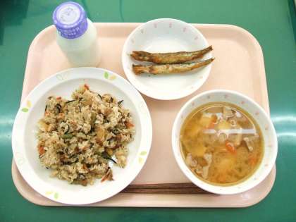 *豆入りひじきごはん *ししゃものカレー揚げ *とん汁 *牛乳