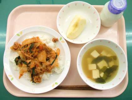 *キムチ丼 *わかめスープ *くだもの(りんご) *牛乳