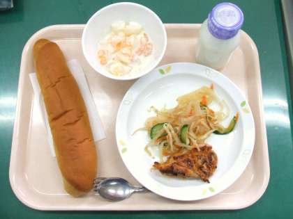 *黒砂糖パン *タンドリーチキン *こんにゃくサラダ *フルーツヨーグルト *牛乳