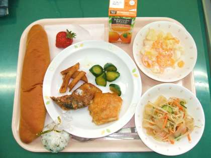 他の学年と同じメニューの他に、バイキングメニューを加え、自分で料理を選んで盛りつけ、いただきました。栄養バランスもしっかり考えて、料理を選びます。