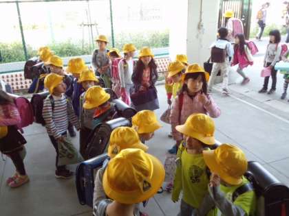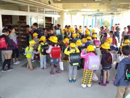 登校のチャイムが鳴る時間が近づいてきました。昇降口に並んで待っています。(4月10日)
