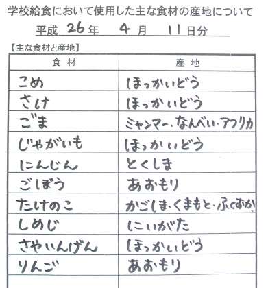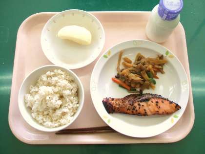*ざっこくごはん *鮭の南部焼き *じゃがいものきんぴら煮 *くだもの(りんご) *牛乳