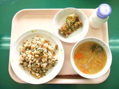 *豆入りひじきごはん *ちくわの磯辺揚げ *みそしる *牛乳