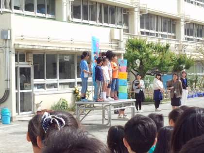 児童朝会で、あいさつ運動のよびかけをしました。(5月12日)