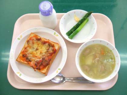 *ピザトースト *ポトフ *ゆでアスパラのマヨネーズ添え *牛乳