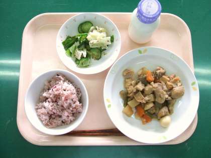 *黒米ごはん *とり肉と里芋のうま煮 *野菜のゆかりかけ *牛乳