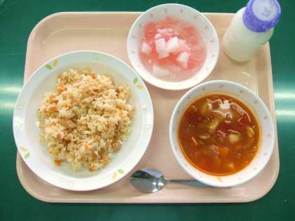 *ツナライス *ミネストローネ *あじさいゼリー *牛乳
