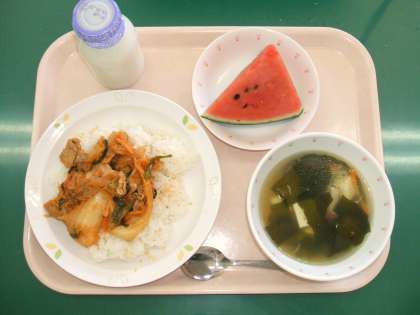 *キムチ丼 *わかめスープ *くだもの(すいか) *牛乳