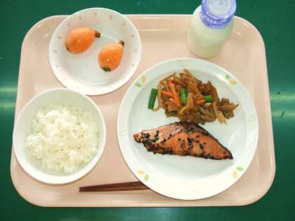 *ごはん *鮭の南部焼き *じゃがいものきんぴら煮 *くだもの(びわ) *牛乳