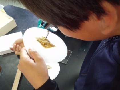 葉ででんぷんが作られていることをたたき染めで確かめました。(6月19日)