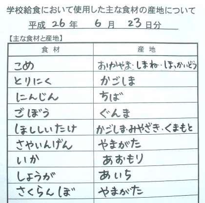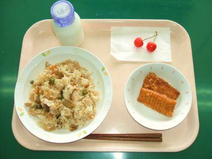 *とり五目ごはん *いかのカリン揚げ *くだもの(さくらんぼ) *牛乳