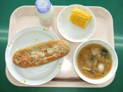 *うぐいす揚げパン *肉団子入り春雨スープ *ゆでとうもろこし *牛乳