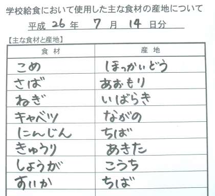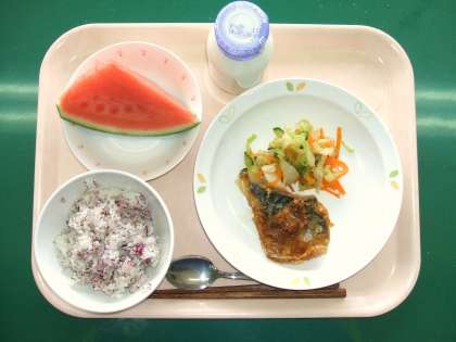 *ゆかりごはん *サバの南蛮揚げ *野菜のしょうが風味 *くだもの(すいか) *牛乳