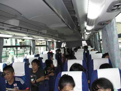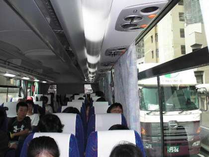 朝の渋滞で混んでいますが、バスの中では楽しく話をしながら過ごしています。(8時55分)