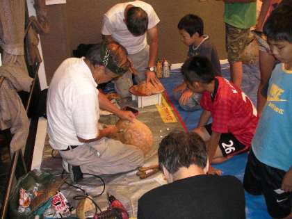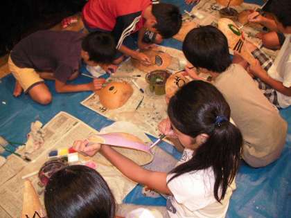 夕食後、ふくべ細工をしました。みんないろいろな形を利用して色を塗っていました。(19時30分)