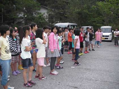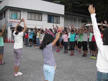 昨日から雨は降っていません。宿舎の外で朝会をしました。(6時)