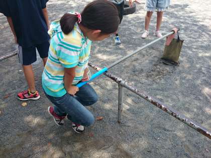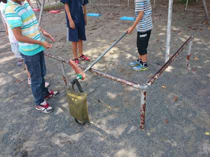 棒に重い物をぶら下げて手応えを体感しました。(9月3日)