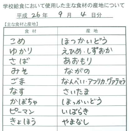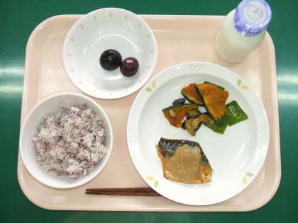 *ゆかりごはん *サバのごまだれかけ *夏野菜のポン酢がけ *くだもの(巨峰) *牛乳