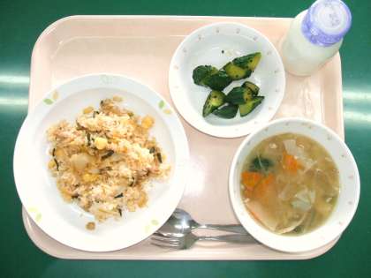 *キムチチャーハン *ワンタンスープ *ピリ辛きゅうり *牛乳