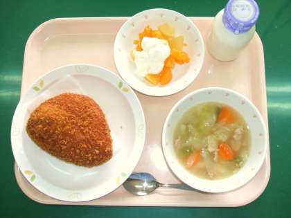 *カレーパン *白いんげんのいなか風スープ *フルーツヨーグルト *牛乳