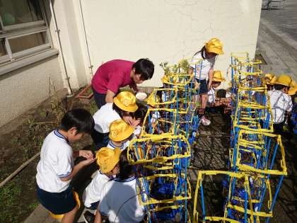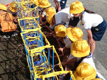 校庭のプランターにスイスチャードという野菜の種を蒔きました。成長すると茎がカラフルになります。(10月16日)