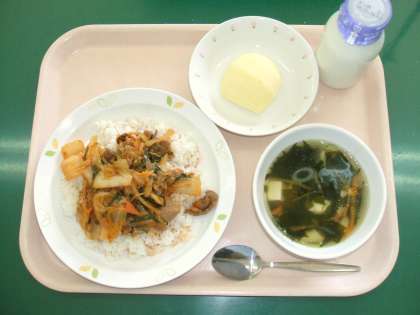 *キムチ丼 *わかめスープ *くだもの(りんご) *牛乳