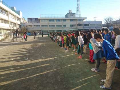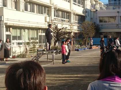 今朝は、晴れましたが寒さが増していました。6年生のあいさつで朝会が始まりました。(1月19日)